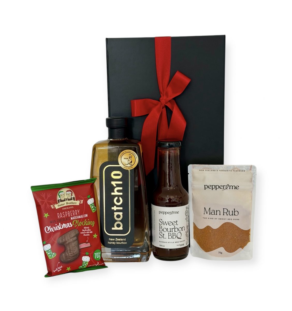 Indulge the bourbon lover in your life with the Bourbon Delight gift box! This exquisite selection features New Zealand-made honey bourbon by Batch 10, delicious Pepper and Me BBQ sauce, flavorful Man Rub seasoning, and delightful Potter Brothers raspberry marshmallows.