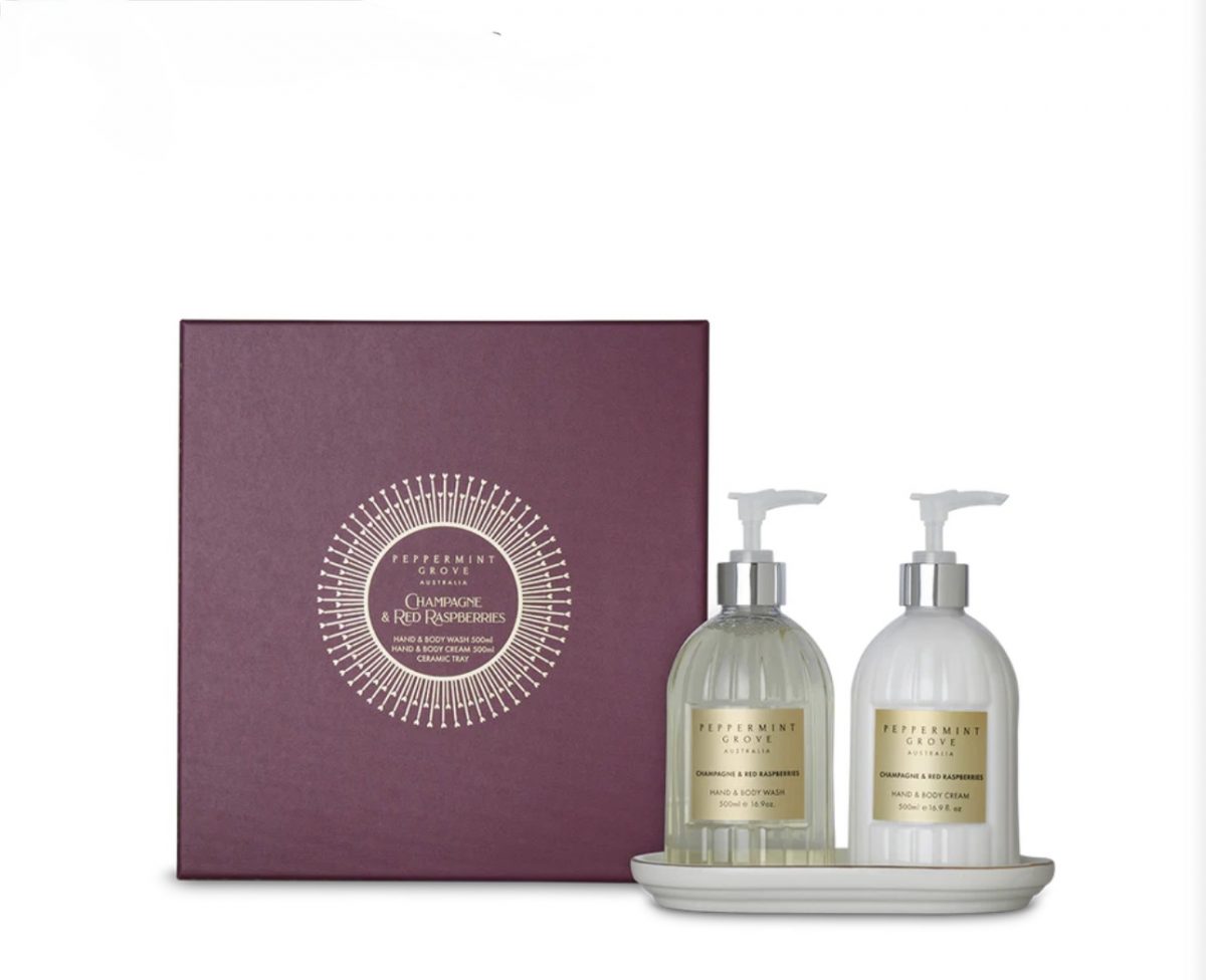 This luxurious Hand Care Gift Set will become your new kitchen or bathroom staple. Featuring our signature Hand & Body Wash and Hand & Body Cream 500ml in our limited edition Champagne & Red Raspberries fragrance. Display on our special edition, gold foiled Ceramic Tray.