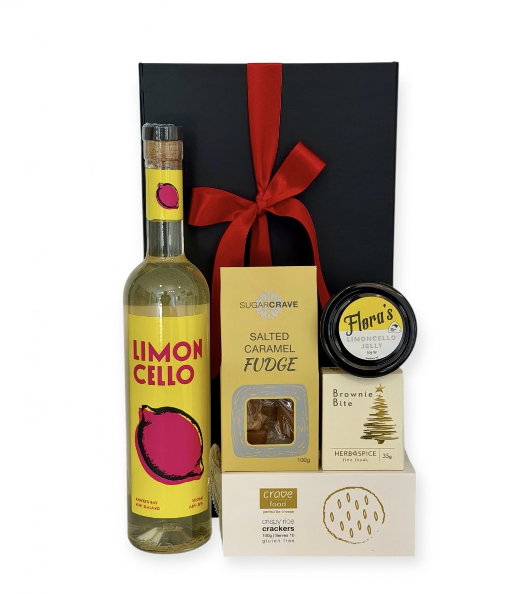 Indulge in the Citrus Noel gift box, a delightful collection featuring a 500ml bottle of exquisite Limoncello crafted in Hawke’s Bay, NZ. This fabulous assortment also includes creamy salted caramel fudge, gourmet Crave crackers, a rich brownie bite, and tangy limoncello jelly.